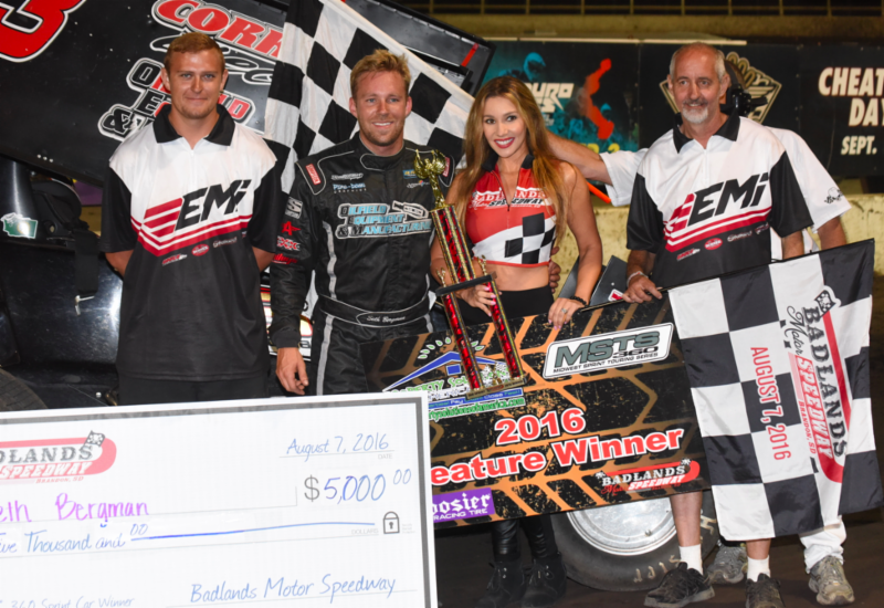 BRANDON, S.D. (Aug. 9, 2016) – Seth Bergman returned to Victory Lane on Sunday at Badlands Motor Speedway following a successful performance during the 26th annual Arnold Motor Supply 360 Knoxville Nationals.