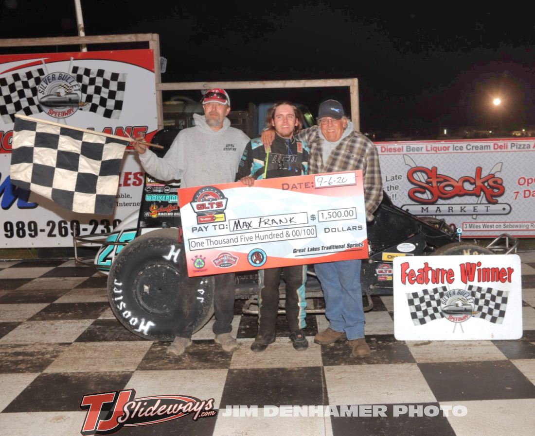 Max Frank with his family and crew in victory lane Saturday night at Silver Bullet Speedway with the Great Lakes Traditional Sprints. (Jim Denhamer Photo)