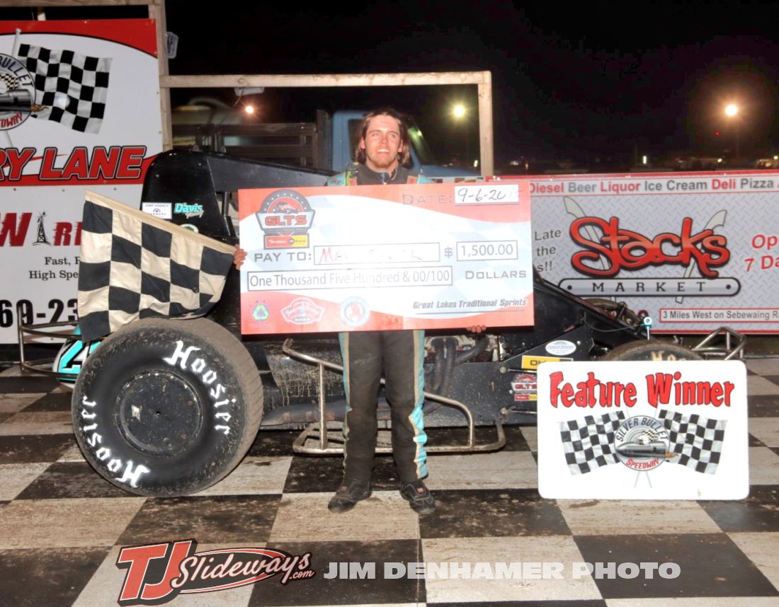 Max Frank in victory lane Saturday night at Silver Bullet Speedway with the Great Lakes Traditional Sprints. (Jim Denhamer Photo)