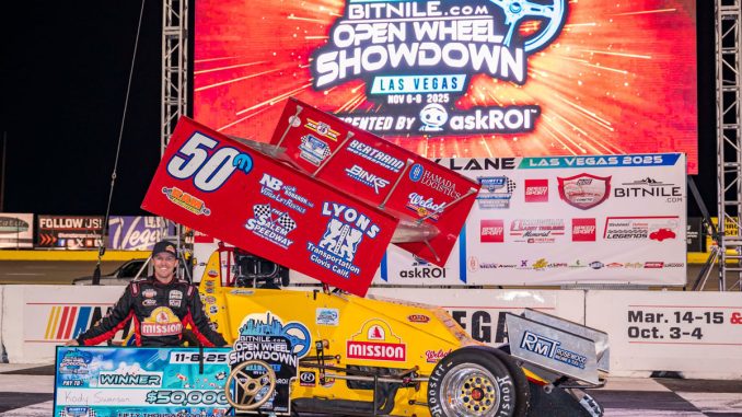 LAS VEGAS, NV (November 8, 2025) – Kody Swanson of Kingsburg, California used high side magic to take his second consecutive $50,000 jackpot, winning Saturday’s 100-lap feature at the BITNILE Open Wheel Showdown presented by askROI. The victory in the Elliott’s Custom Trailers & Carts Winged Sprint Cars came at the Bullring at Las Vegas Motor Speedway in the third annual event.