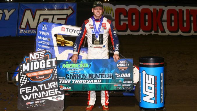 Merced, California (November 21, 2025)………Cannon McIntosh took a giant leap toward his first career USAC NOS Energy Drink Midget National Championship with his decisive victory during the Golden State Invasion’s Midget Madness on Friday night at California’s Merced Speedway.
