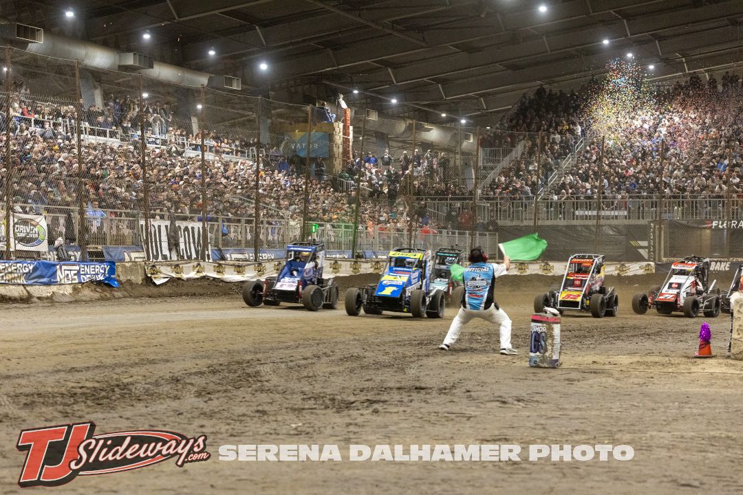 1R7A6038 Emerson Axsom (39A), Kyle Larson (1K), Logan Seavey (39), Blake Hahn (52) and Christopher Bell (21CB) (Serena Dalhamer photo)