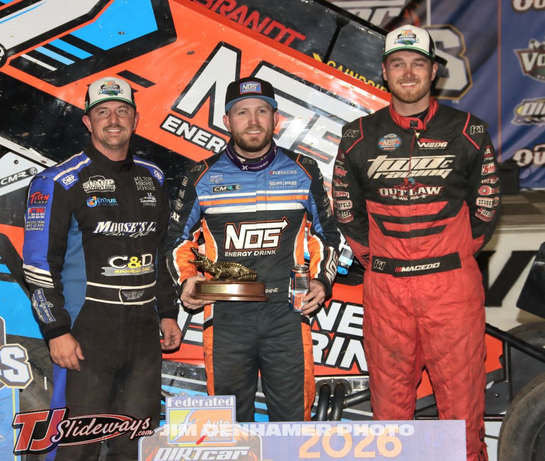 (l to r) Third place Brock Zearfoss, winner Tyler Courtney, and second place Cole Macedo following Friday’s ASCS National Tour feature at Volusia Speedway Park. (Jim Denhamer Photo)