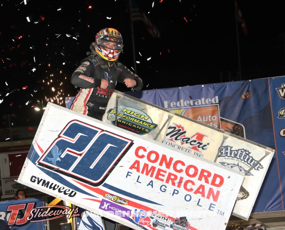 Brady Bacon celebrates his feature victory on Monday with the ASCS National Tour during DIRTcar Nationals at Volusia Speedway Park. (Jim Denhamer Photo)