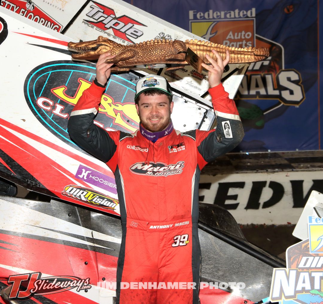 Anthony Macri in victory lane with the “Big Gator” after winning the feature event and overall DIRTcar Nationals title. (Jim Denhamer Photo)