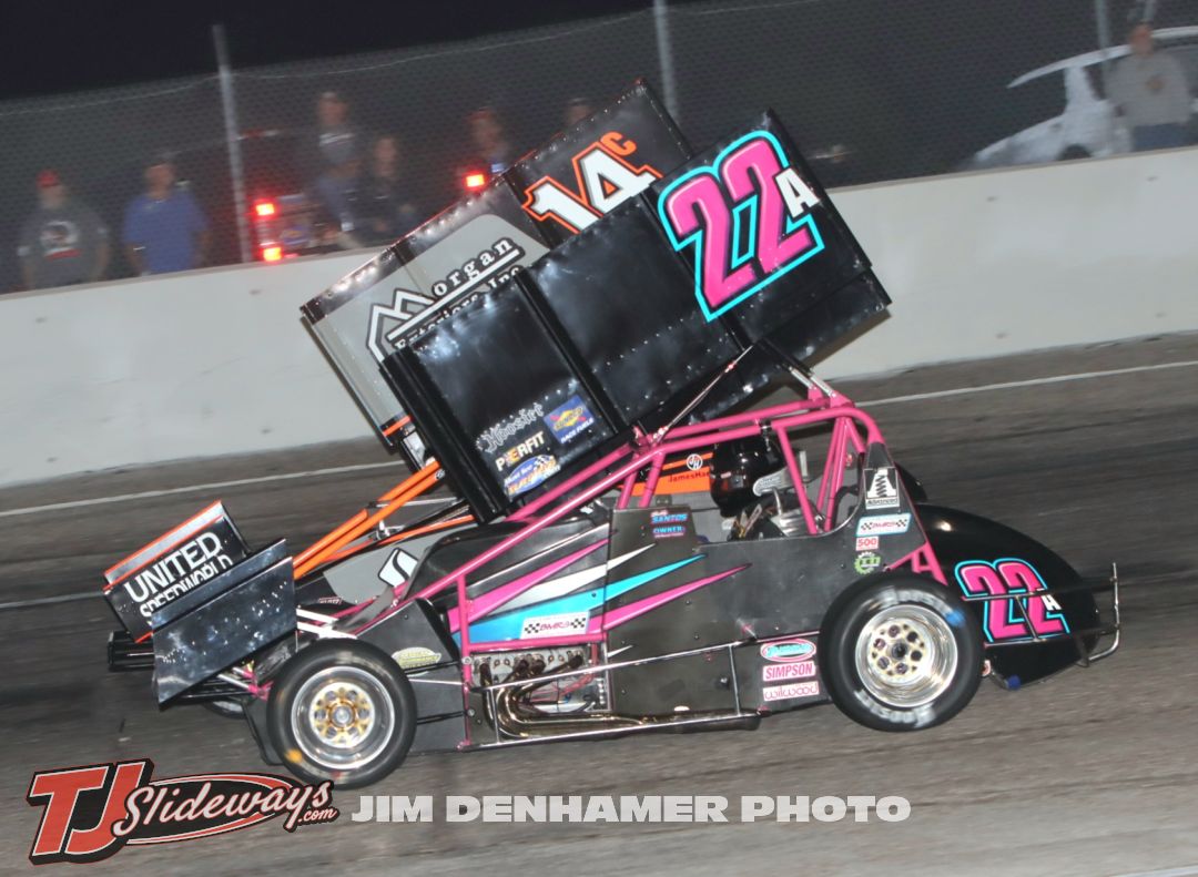 Bobby Santos III (#22A) racing with Davey Hamilton Jr. (#14) Saturday at Showtime Speedway. (Jim Denhamer Photo)