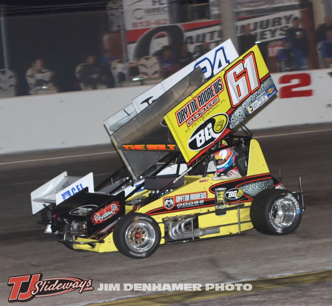 Colton Bettis (#61) racing with Dylan Reynolds (#24) Saturday at Showtime Speedway. (Jim Denhamer Photo)