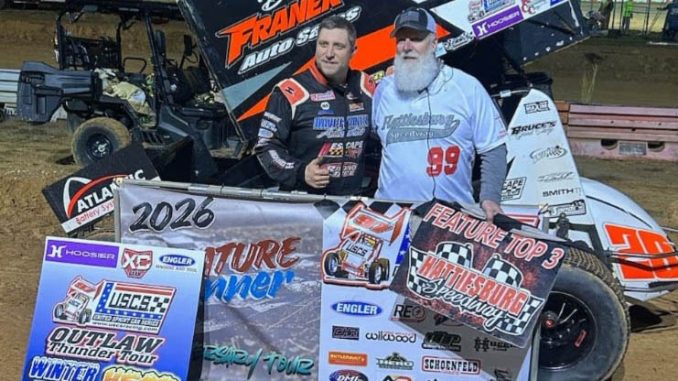 HATTIESBURG, MS – Friday, February, 27, 2026 Davie Franek of Wantage, NJ won his fourth United Sprint Car Series Presented By Hoosier Racing Tire 25-lap Feature Race in Round 5 of the Winter Heat Shootout on Friday night at Hattiesburg Speedway. Franek made it a clean sweep of the event by leading all 25 laps, winning the Hoosier Speed Dash and his Heat Race.