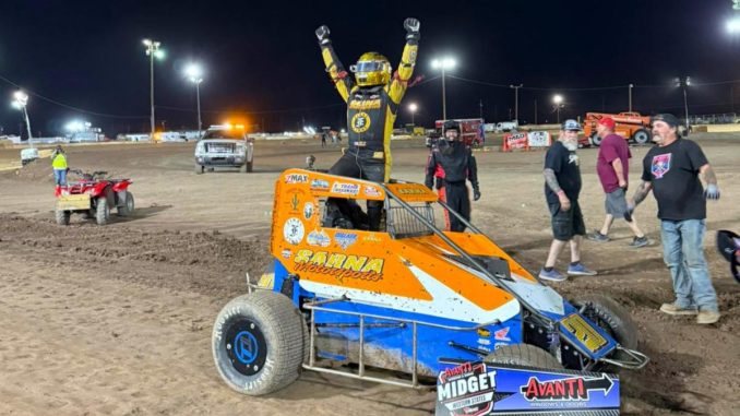 Imperial, California (March 14, 2026)………It had been nearly 18 seasons since C.J. Sarna last celebrated a feature victory with the USAC Avanti Windows & Doors Western States Midget series.