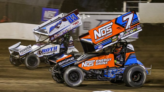 Indianapolis, IN’s Tyler Courtney wasted no time powering from fourth to the lead, snatching the top spot from Sheldon Haudenschild on an early restart. Then “Sunshine” ripped away and looked as if he may be cruising the Clauson Marshall Racing No. 7BC to a victory in his home state. But then the hottest driver on the World of Outlaws tour came alive.