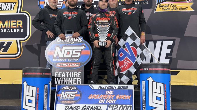 KNOXVILLE, Iowa (April 25, 2026) – David Gravel was in a familiar spot on top of the podium Saturday night, April 25, with the NOS Energy Drink World of Outlaws at Knoxville Raceway. The Watertown, Connecticut driver earned $12,000 for his fifteenth career victory at Knoxville aboard the Big Game Motorsports #2 machine.